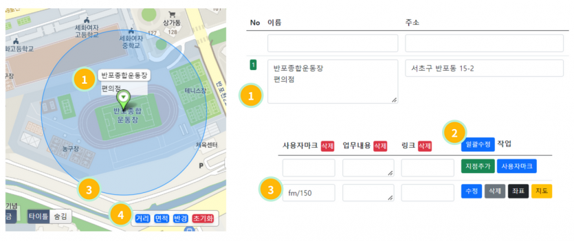 - 마크 주변에 반경을 표시해줍니다. 사용자 마크에 bm/100, /300 이런식으로 입력하면 됩니다.